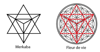 La Merkaba est souvent vue comme un vaisseau permettant aux êtres humains d’accéder au monde divin, notamment par la méditation. En version plate, ce symbole peut être facilement tracé à partir d’une fleur de vie.